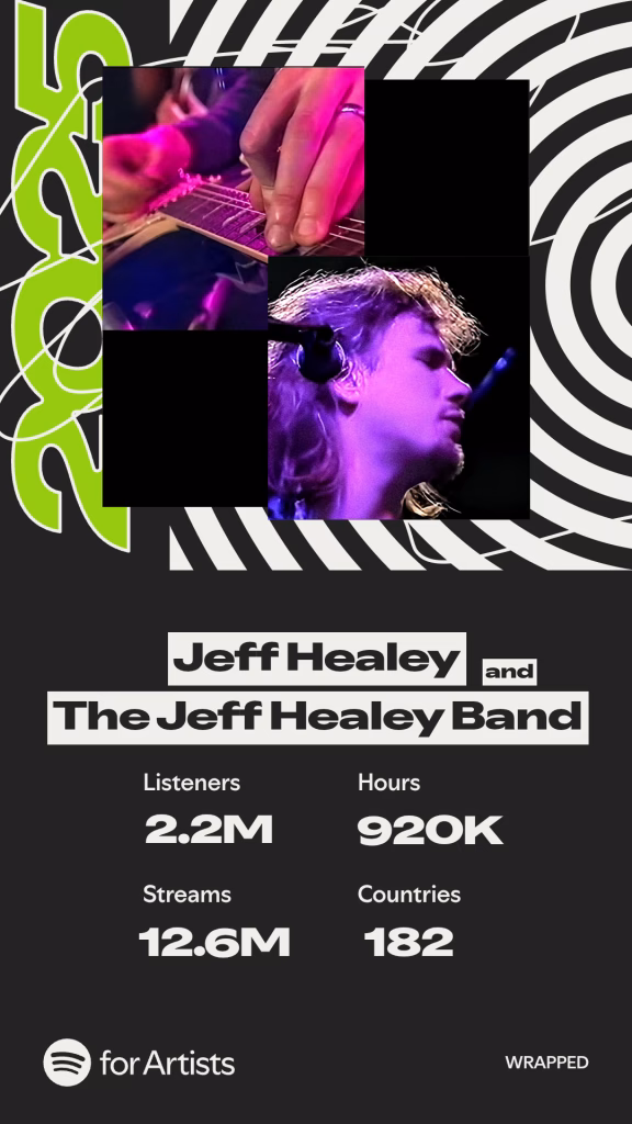 The annual streaming numbers for 2025 are in. To say it’s overwhelming would be an understatement. SPOTIFY has tracked, 2.2 MILLION listeners, 12.6 Million streams! Wow. So wonderful to know you are all still out there, helping to keep Jeff’s legacy alive…